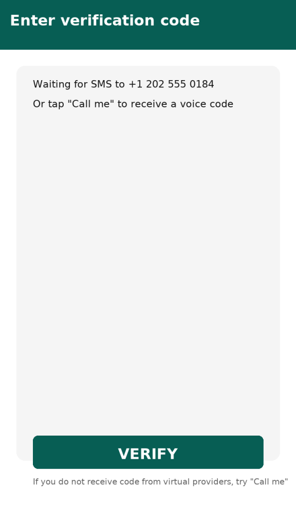 If you don’t get SMS within 2–3 minutes, tap Call me on the WhatsApp screen WhatsApp will call the number and read the code aloud. Many virtual providers reliably forward voice calls even when SMS fails. (See screenshot bellow).